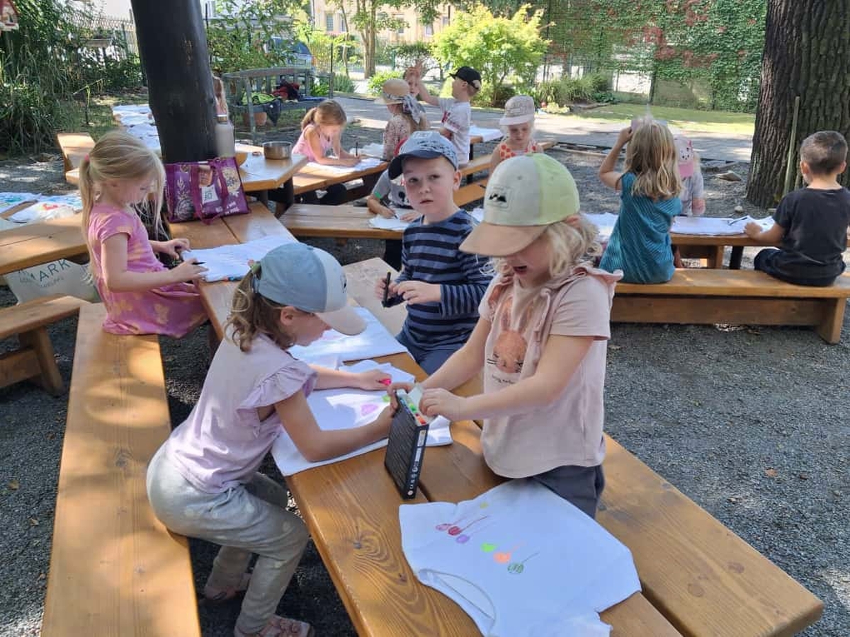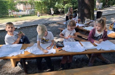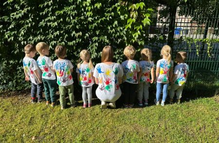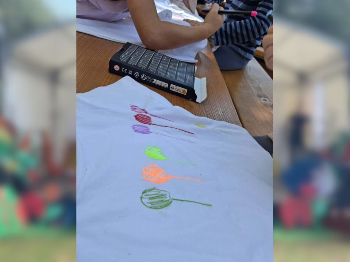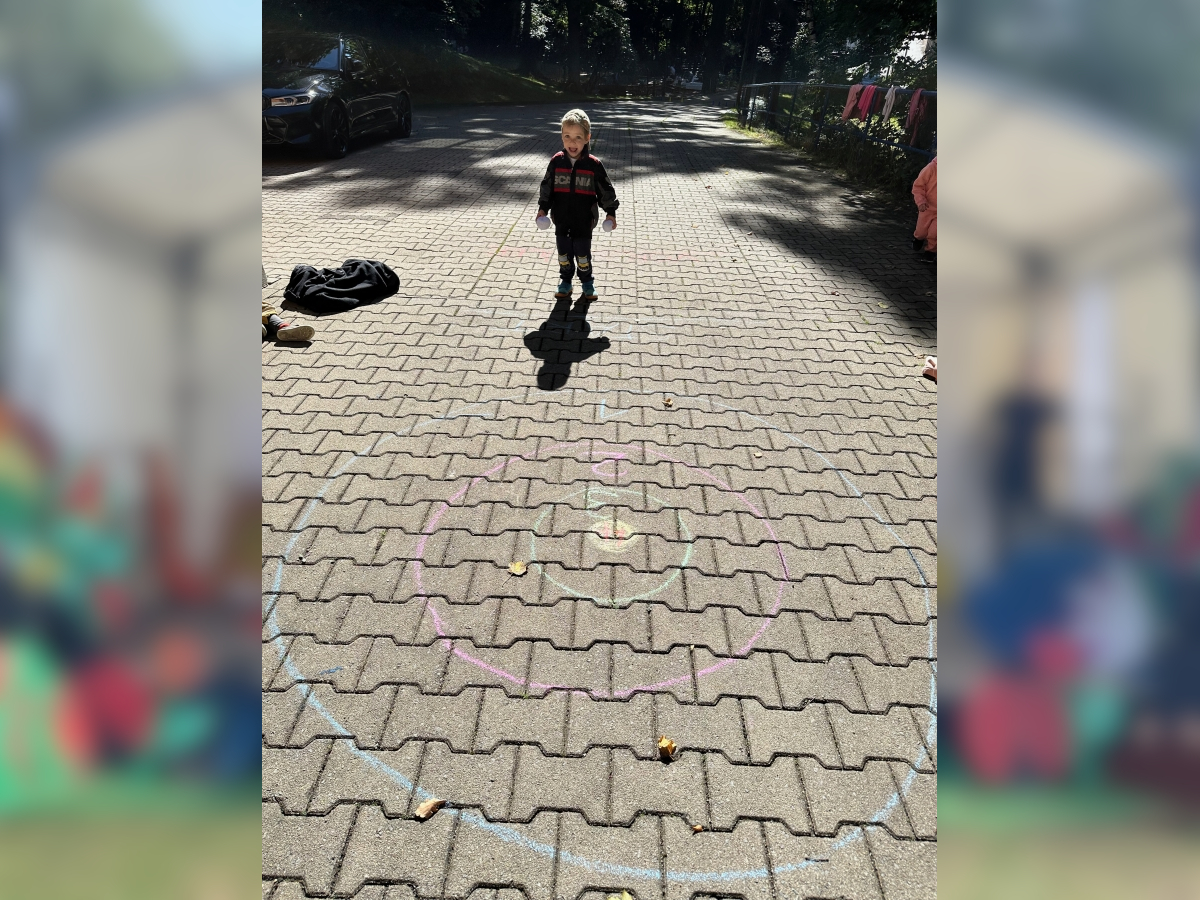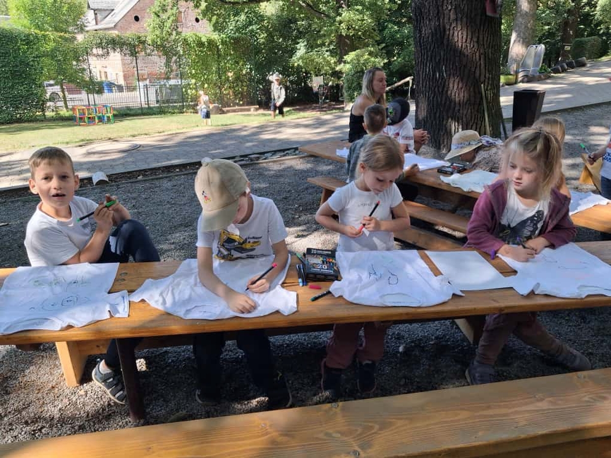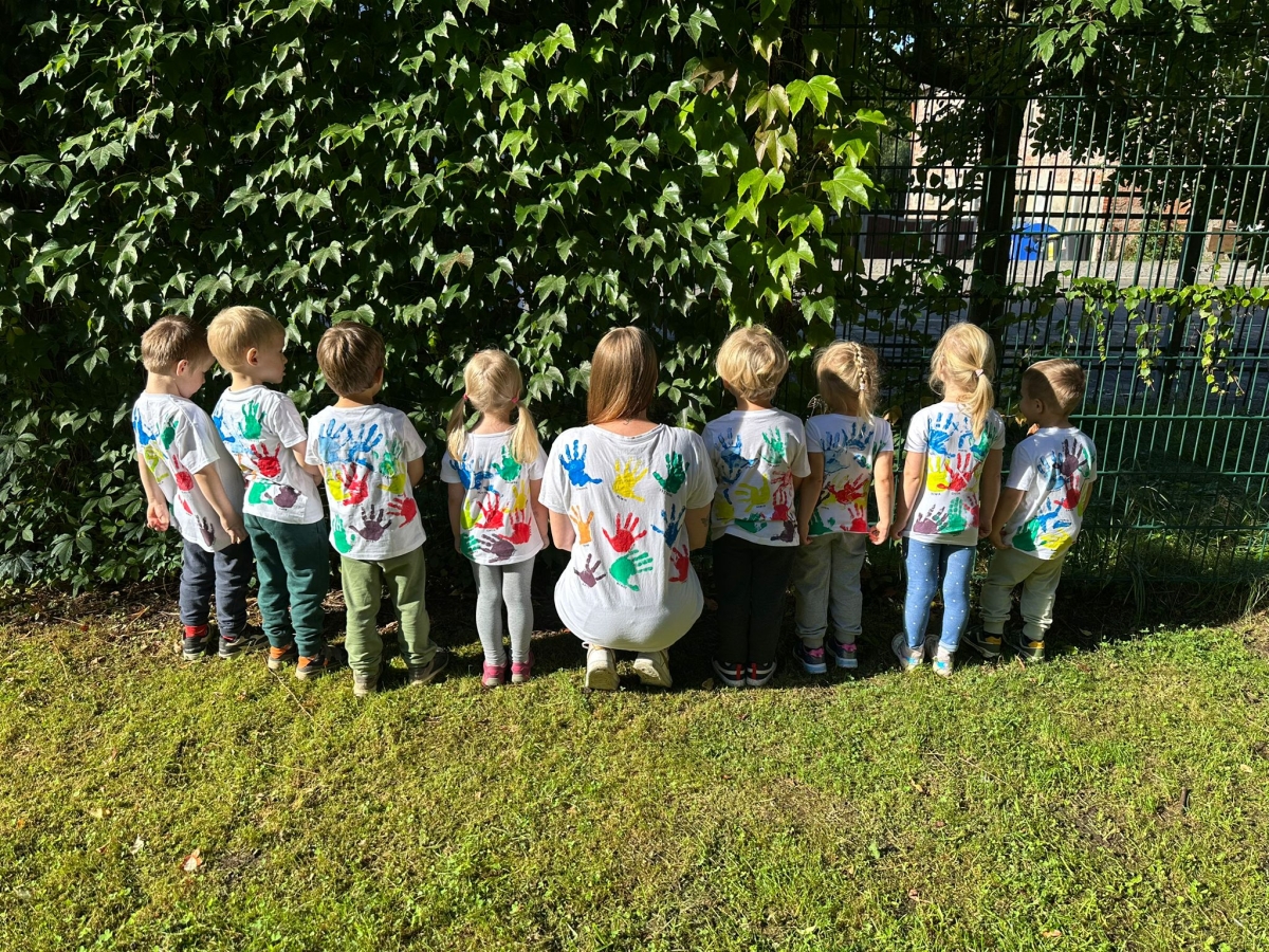 Gemeinsam stellten die Kinder die Zahl „20“ auf dem Hof nach – ein wunderschöner Anblick! Anschließend durfte jedes Kind sein eigenes Jubiläums-T-Shirt bemalen, das viele stolz durch die Woche trugen.