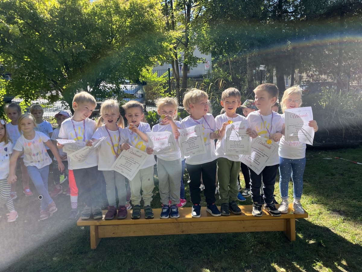 Beim großen Sporttag konnten sich alle an verschiedenen Stationen ausprobieren – vom Bobby-Car-Rennen über Hobby Horsing bis hin zum Weitsprung. Zum Abschluss gab es natürlich eine feierliche Siegerehrung für alle kleinen Sportlerinnen und Sportler.